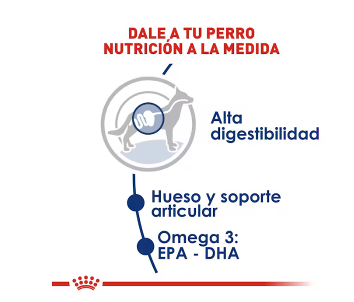 Ayuda a promover la salud de los huesos y de las articulaciones de los perros de razas grandes, que pueden resentirse debido al peso de su cuerpo.