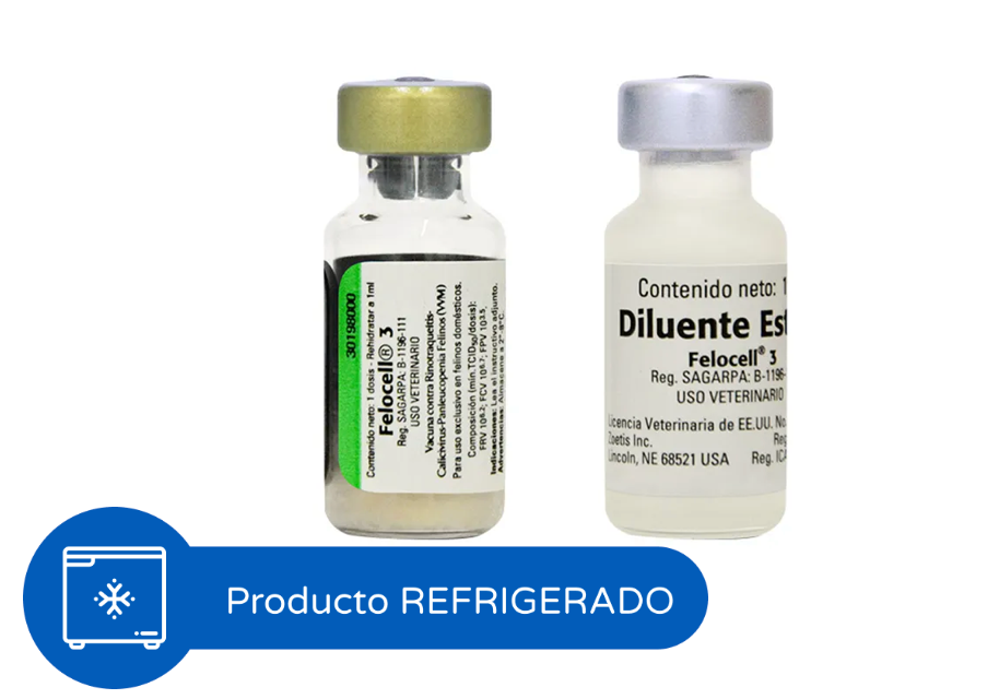 Felocell® 3 es para la vacunación de gatos sanos como una ayuda en la prevención de la Rinotraqueitis Viral Felina (FVR) causada por el virus Herpes Felino - 1, la enfermedad respiratoria causada por el Calicivirus Felino (FCV) y la Panleucopenia Felina (FPL) causada por el Parvovirus Felino (FPV). Felocell® 3 contiene cepas atenuadas del virus de la Rinotraqueitis, Calicivirus y Panleucopenia Felina (cepas de Leopardo Johnson Snow), propagados en líneas celulares establecidas. Primovacunación: Los gatos sanos de 12 semanas de edad o más deben recibir 2 dosis administradas con un intervalo de 3 a 4 semanas. Si se vacunan antes de las 12 semanas de edad, se deberán revacunar cuando cumplan las 12 semanas de edad. Revacunación: Se recomienda la revacunación anual con una sola dosis