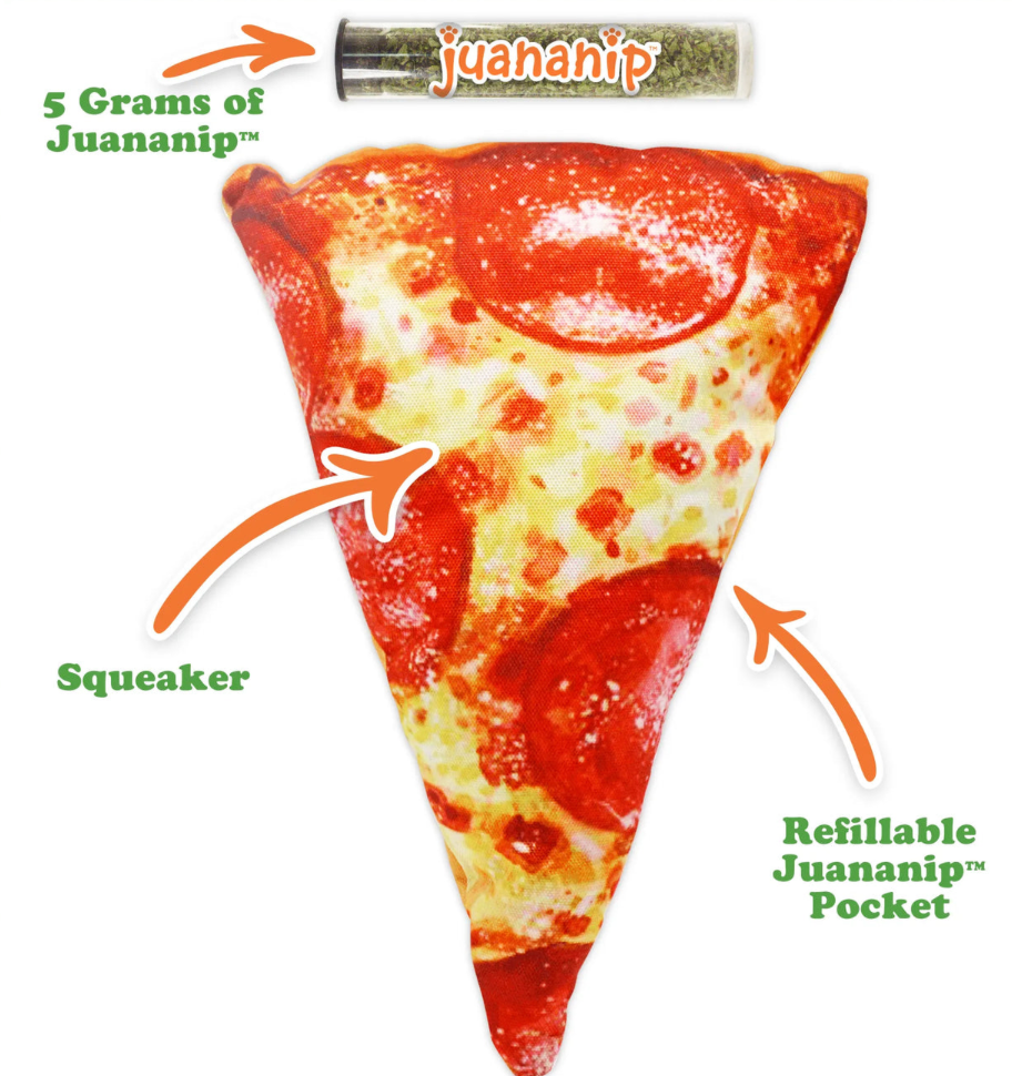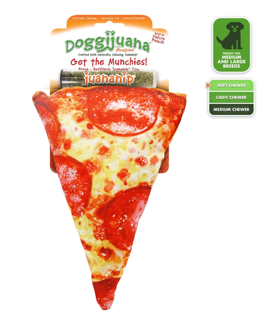 ¡Sirve un trozo de felicidad cursi para tu cachorro! El peluche Doggijuana® Pizza Slice es la indulgencia perfecta para razas medianas y grandes con un estilo de masticación suave. Con deliciosas vibraciones de pepperoni y relleno de Juananip® recargable, esta rebanada está garantizada para mantener a su amante de la comida peluda entretenido y tranquilo durante el tiempo de juego.