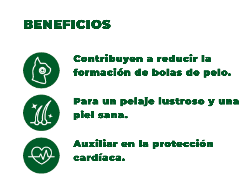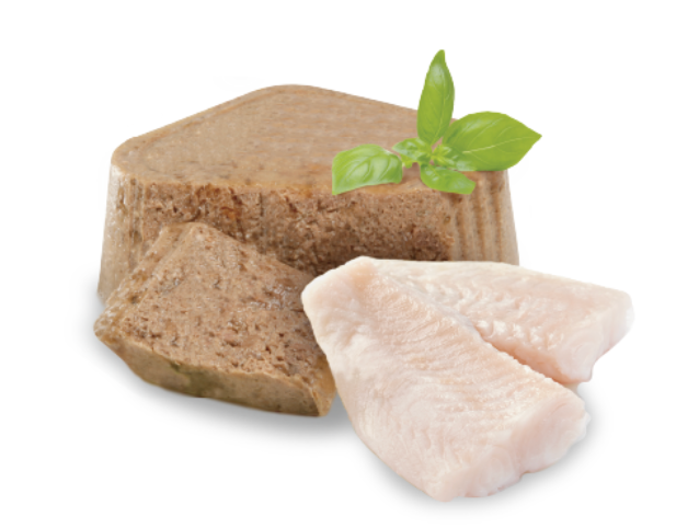 Agua suficiente para el proceso, carne y derivados de pollo (retazo, hígado, corazón) y/o cerdo (hígado, pulmón, bazo), pescado blanco y sus derivados (cabezas y aletas), derivados de origen vegetal (fibra de guisantes, achicoria), agentes palatantes (glicina), aditivos técnicos (algarrobo, goma xantana, carragenina, goma de algarrobo), minerales (carbonato de calcio, cloruro de potasio, carbonato de sodio), vehículos (harina de maíz, sepiolita, mezcla natural de esteatita y clorita, ácido silícico, sipernat) conservadores (nitrato de sodio), varios azúcares (dextrosa), aditivos nutricionales (vitamina E, taurina, sulfato de zinc monohidratado, vitamina B1, biotina, sulfato de manganeso monohidratado, sulfato de cobre pentahidratado, yodato de calcio anhidro).