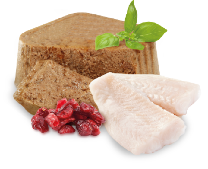 Agua suficiente para el proceso, carne y derivados de ave de corral (retazo) y/o cerdo (hígado, pulmón, bazo), pescado blanco y sus derivados (cabezas y aletas), aditivos técnicos (algarrobo, goma xantana, carragenina, goma de algarrobo, xantana), agentes palatantes (glicina), frutas: arándano, minerales (carbonato de calcio, cloruro de potasio, carbonato de sodio), vehículos (harina de maíz, sepiolita, mezcla natural de esteatita y clorita, ácido silícico, sipernat), conservadores (nitrato de sodio), varios azúcares (dextrosa), aditivos nutricionales (taurina, vitamina E, DL metionina, sulfato de zinc monohidratado, vitamina B1, sulfato de manganeso monohidratado, biotina, sulfato de cobre pentahidratado, yodato de calcio anhidro).