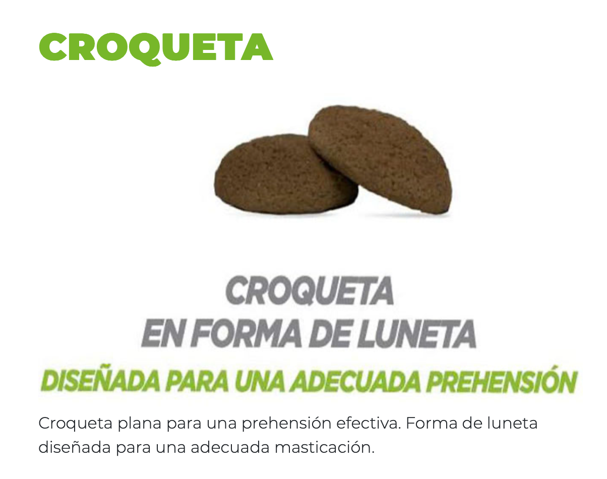 Harina de carne de pollo, arroz cervecero, grasa de pollo, maíz, pulpa de remolacha, harina de pescado, aceite de pescado, sabor natural de pollo, extracto de raíz de achicoria, fructooligosacáridos, cloruro de sodio, cloruro de potasio, cloruro de colina, betaglucanos y mananooligosacaridos (derivado de la pared celular de saccharomyces cerevisiae activa 1x10UFC/g), taurina, acetato de retinol (fuente de vitamina A), colecalciferol (fuente de vitamina D), acetato de DL-α-tocoferol (fuente de vitamina E), menadiona nicotinamida bisulfato (fuente de vitamina K), ácido ascórbico (fuente de vitamina C), mononitrato de tiamina (fuente de vitamina B1), riboflavina (fuente de vitamina B2), ácido nicotínico (fuente de vitamina B3), clorhidrato de piridoxina (fuente de vitamina B6), cianocobalamina (fuente de vitamina B12), D-biotina (fuente de vitamina H), D-pantotenato de calcio (fuente de vitamina B5), ácido fólico, oligoelementos (proteinato de zinc, proteinato de manganeso, proteinato de cobre, EDDI, glicinato de hierro, selenito de sodio), extracto de Yucca schidigera, mezcla de tocoferoles y extracto de romero como conservadores.