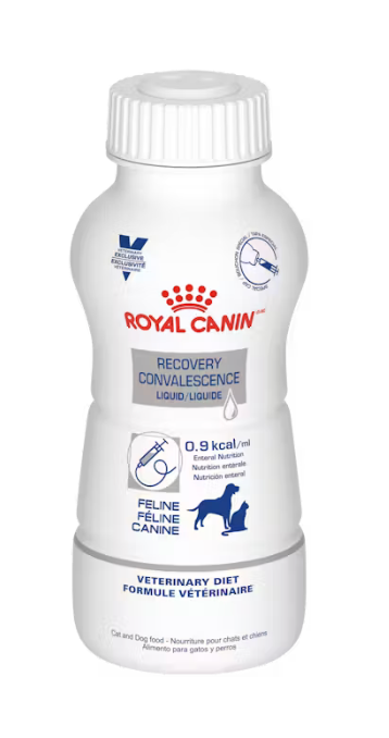 ROYAL CANIN VETERINARY DIET Canine and Feline RECOVERY LIQUID es una dieta completa y balanceada para gatos y perros adultos, formulada para proveer soporte nutricional cuando se encuentran bajo cuidado veterinario. Disponible en: 240 gramos